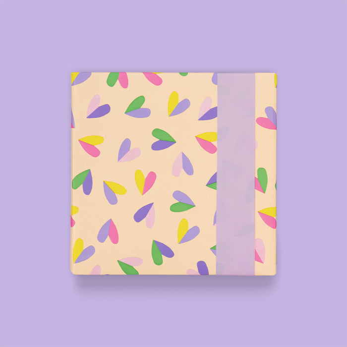 Aan de ene kant een zachte, effen lila tint, perfect voor elke gelegenheid. Aan de andere kant word je verrast door een speelse print van kleurrijke hartjes die liefde en vrolijkheid uitstralen.