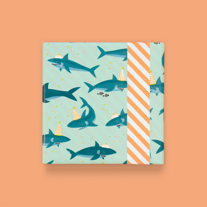 Aan de ene kant een volijke streep en aan de andere kant haaien die elk verjaardagscadeau kunnen opvrolijken!