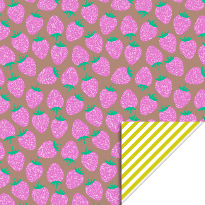 Aan de ene kant schitterende gele strepen die een vrolijke en zonnige uitstraling geven, perfect voor elke gelegenheid. Of je nu een verjaardag, een feest of gewoon een 'ik denk aan jou'-cadeau inpakt, deze kant brengt direct een glimlach op het gezicht van de ontvanger. En als je op zoek bent naar iets speelser, draai het papier om en ontdek een schattige aardbeienprint! Deze print brengt een vleugje zomer en frisheid, waardoor je cadeau er extra aantrekkelijk uitziet.